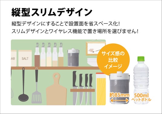 「ANGA-PS920-TV-W」は、送信機をテレビに接続することで、テレビの音を手元のスピーカーでもお楽しみいただくことができます。食卓やキッチンに置いてもスペースを取らない、スリムな縦型デザインが特徴です。IPX2の防滴仕様※なので、お料理しながらでも安心してご使用いただけます。