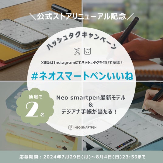 内容:Xまたはインスタグラムで『#ネオスマートペンいいね』をつけて投稿すると、抽選で2名様に最新スマートペン&デジアナ手帳をプレゼント!