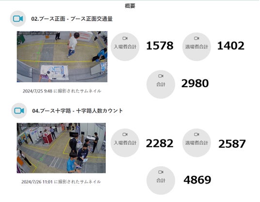 ブース内ではキヅクモカメラ4台を設置し、前回の展示会で好評を博したキヅクモのマーケティング機能を用いて、2日間のリアルなデータを計測しました。今回は2小間のブースであったため、主に人数カウントのレポートを作成し、各通路の通行人数と時間帯の傾向を把握し、取得データを基に人員配置に役立てました。