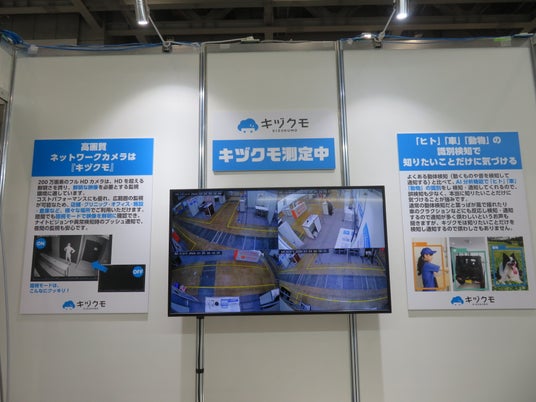 展示物を守るための防犯に加え、展示会場の入口に設置して一般来場者の入場把握をすること、複数のセミナー会場に設置して同時並行で開催するセミナーの進行状況を遠隔監視することを目的に、キヅクモを導入いただきました。