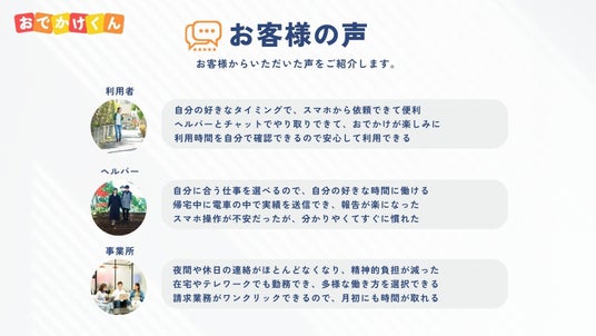 画像2.:お客様の声を利用者、ヘルパー、事業所ごとにまとめた画像。内容の詳細はWebサイトに掲載。