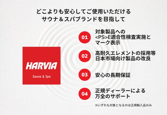 HARVIA JAPANは日本市場で展開する10kW以下のサウナヒーター全機種について電気安全法の基準を満たす厳しい検査を実施し、<PS>Eマークを表示。安全性が証明された製品のみを販売しています。また、ショールームの運営と販売・施工・メンテナンスを行うハルビア サウナ ディーラーを全国に展開しているため、見て触って体感し納得して購入でき、アフターサポートも迅速にご提供できます。