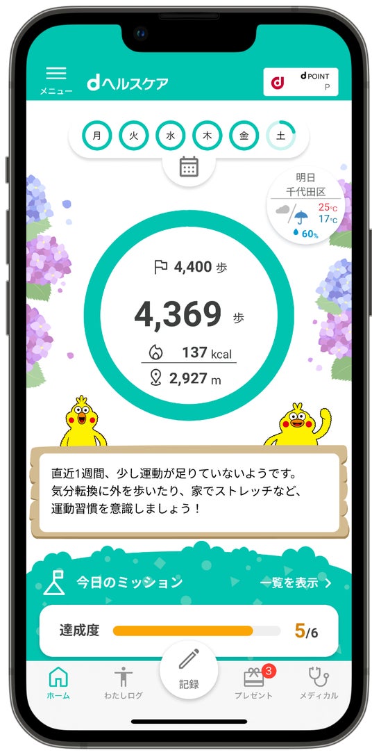 「dヘルスケア」は、日々の歩数や、体重・血圧・脈拍・体温を記録し管理できるほか、健康ミッションをクリアすると抽選でdポイントがもらえるなど、楽しく健康習慣を身につけることを目的としたスマートフォン向けアプリで、累計1500万以上ダウンロードされています。このたび、アプリ利用者の健康習慣の定着を促進するべく、Godotの独自技術を活用したUXデザインの個別最適化に取り組みます。