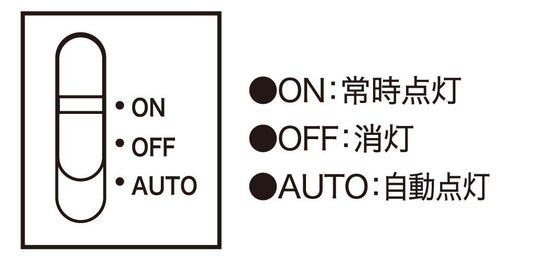 明暗センサーで周囲が暗く(約15lux)なったことを検知し、人感センサーで下図の範囲内での人や動物の動き(熱)を検知して約10秒間、自動で点灯します。
