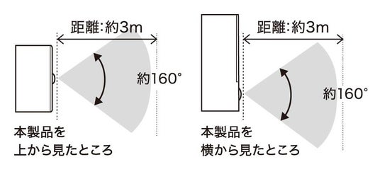 ※人以外でも熱源となるもの(車、動物、木の枝、洗濯物の揺れ、空調機、室外機の風、暖房機の温風など)にも反応します。特に強い熱源は範囲外でも検知する場合があります。