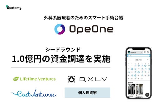 外科系医療者のための医療DX「オペワン」を提供する株式会社クオトミー(東京都千代田区、代表取締役CEO 大谷隼一、以下「当社」)は、シードラウンドにおいてQXLV(クオンタムリープベンチャーズ)をリード投資家として、East Ventures、個人投資家、既存株主であるライフタイムベンチャーズを引受先とした総額1億円の資金調達を実施したことをお知らせします。
