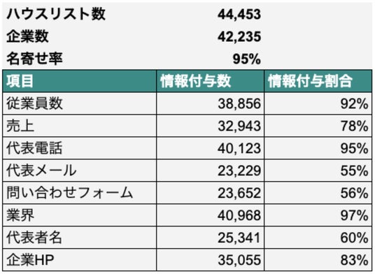 確認可能なデータイメージです。上記の例では44,453件のハウスリストに対して、95%の名寄せ率企業ユニーク数で34,235社となり、業界や従業員数など各項目ごとの企業情報付与割合を確認いただけます。
