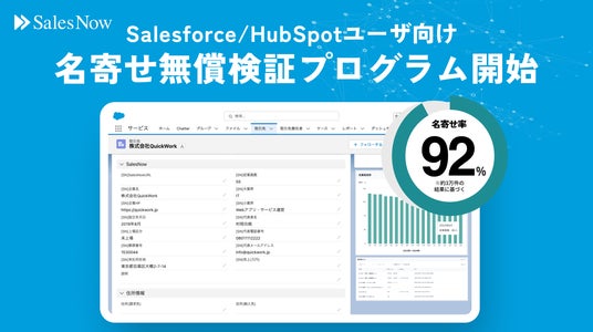 株式会社SalesNow(本社:東京都渋谷区、代表取締役CEO:村岡 功規)は、セールスチームの武器となるデータベース「SalesNow」にて、Salesforce/HubSpotユーザ限定で、ハウスリストの名寄せ無償検証プログラムの提供を開始したことをお知らせします。