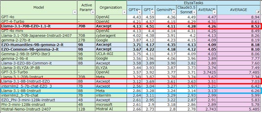 Llama-3.1-70B-EZO-1.1-it: ElyzaTasksで「gpt-4o-miniを超えるスコア/日本最高峰のスコア」を達成/Llama-3.1-8B-EZO-1.1-it: 軽量ながら大幅な性能向上を実現