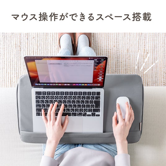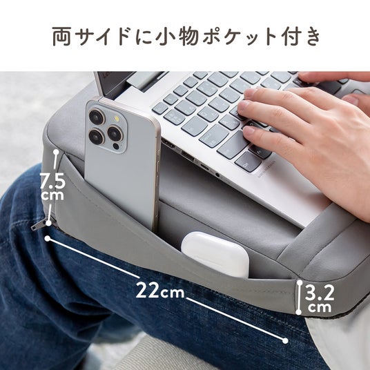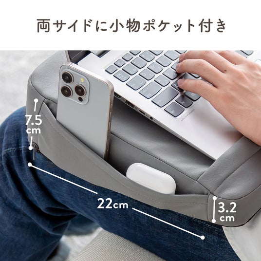膝上テーブルにはマウスやスマホが収納できるポケットが付いており、小物の整理もラクラク。さらに、200-HUS018GYは横幅54cmと幅広でマウス操作をすることもできます。
