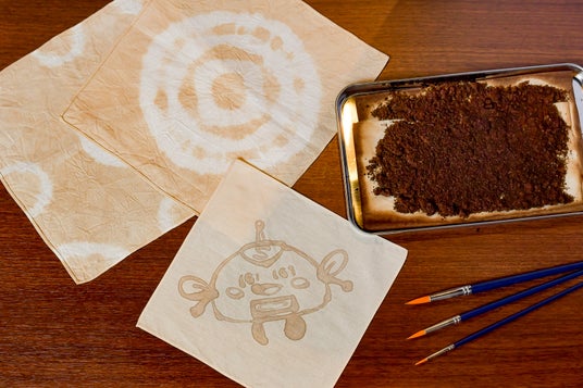 飲み終わったあとのコーヒーの粉を再利用してハンカチなどを染める「コーヒー染め」に挑戦! 模様をつけたり、絵を描いた部分だけ濃く染めたりすることもできます。
