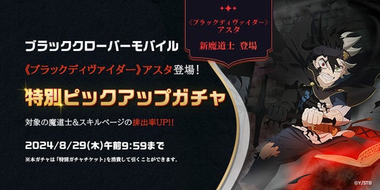 株式会社VIC GAME STUDIOS JAPAN(東京都新宿区、代表取締役:李 同校)は、テレビアニメ『ブラッククローバー』のアプリゲーム『ブラッククローバーモバイル 魔法帝への道 The Opening of Fate』(以下、ブラクロモ)において、本日7月30日(火)よりシーズン15が開始し、特別ピックアップガチャに「《ブラックディヴァイダー》アスタ」が新登場したことをお知らせいたします。