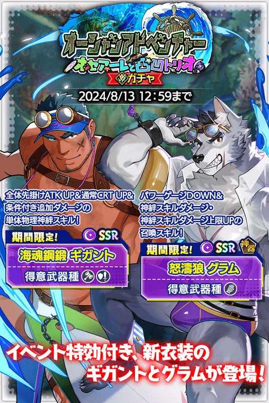さらに、SSR魂友「海魂鋼鍛 ギガント」とSSR神器「怒濤狼 グラム」が入手可能な期間限定の「オーシャンアドベンチャー~オセアーレと凸凹トリオ~」ガチャも登場!