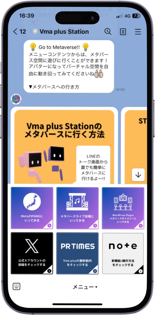 LINE公式アカウントのトークルーム内に表示されるリッチメニューに、メタバースへの入り口を置いておくことができます。
