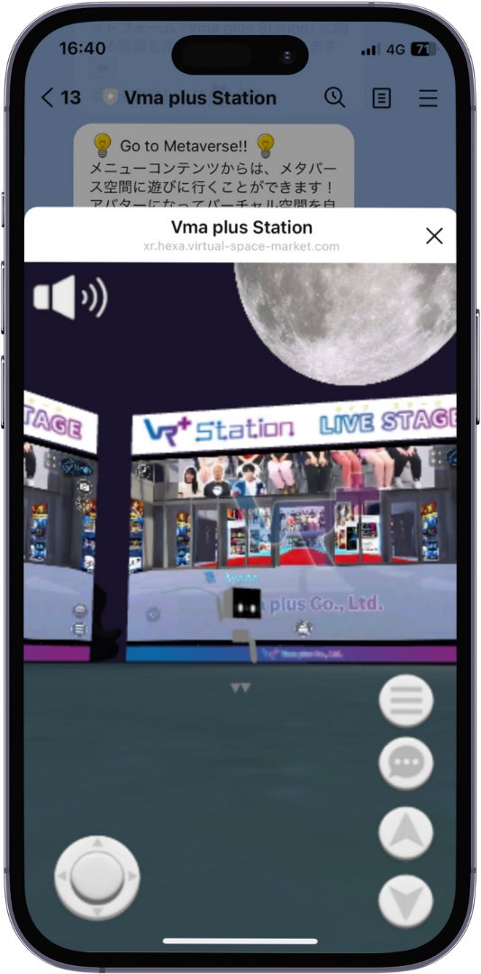 この度提供開始となる、Vma plus Station における " LIFFアプリ版メタバース " とは、LINEアプリのトークルーム上で動作する、 Vma plus Station のメタバースのことです。LINEヤフー株式会社が提供するウェブアプリのプラットフォーム『LIFF(LINE Front-end Framework)』の仕組みを活用しており、ユーザーは使い慣れたLINEから直接仮想空間へ遊びに行くことができます。