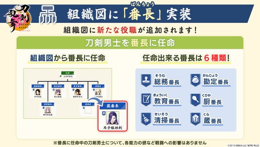 2024年7月23日(火)のメンテナンスにて、新たに「番長」と「審神者証(さにわしょう)」を実装いたしました。刀剣男士を6種類の「番長」にそれぞれ任命できるようになったほか、「審神者証」では審神者としてのこれまでの記録や本丸の状況を確認できます。