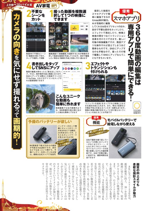 家電専門雑誌『家電批評』2024年7月号にてInsta360 X4が「360度カメラ部門」第1位を獲得しました。