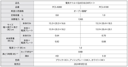 熱制御テクノロジーで世界をリードするタイガー魔法瓶株式会社(社長:菊池嘉聡、本社:大阪府門真市)は、「電気ケトル<QUICK&SAFE+(クイックアンドセーフプラス)>PCS-A080/A100」を、2024年9月1日(日)に発売いたします。