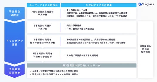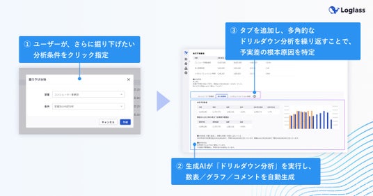 新しいデータ経営の在り方を生み出すDXサービスを提供する株式会社ログラス(本社:東京都港区、代表取締役CEO:布川友也、以下「当社」)は、クラウド経営管理システム「Loglass」にて、生成AIが多角的なドリルダウン分析を自動化し、予実差の根本原因の特定をサポートする「AI予実分析レポート」を7月31日(水)より提供開始しました。これにより分析担当者は煩雑な分析作業を大幅に効率化し、各事業部との戦略議論・改善施策の立案に注力できます。その結果、経営会議で的確な打ち手を意思決定し、素早い改善アクションに繋げることができます。