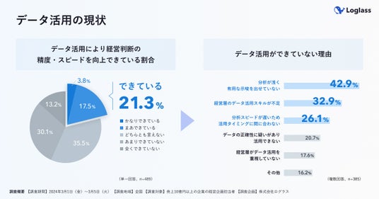 当社が経営企画部門489名を対象に実施した調査によると、データ活用により経営判断の精度・スピードを向上できている企業は、わずか21.3%に留まります。 データ活用ができていない理由としては、「分析が浅い」「データ活用スキルが不足」「分析スピードが遅い」が上位に挙がりました。