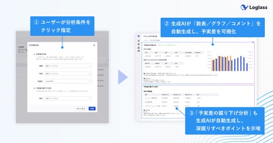 1. 簡単なクリック操作のみで、生成AIが「数表/グラフ/コメント」を自動生成し、予実差を可視化