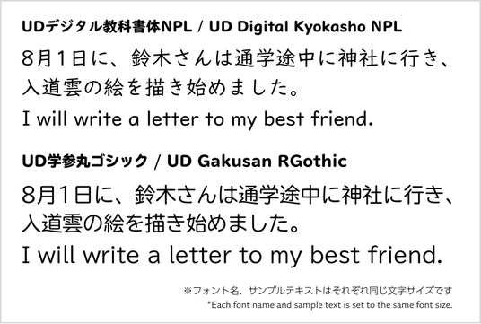 「UDデジタル教科書体NPL」と「UD学参丸ゴシック」は、教育におけるインクルーシブの実現に向けた、学びの環境の助けになる書体ラインナップとして、ロービジョン(弱視)やディスレクシア(読み書き障害)にも配慮できるクリエイティブ制作を実現します。フォントの選択肢が増えることで、学びの現場に携わる方々により多くの見え方・見えにくさ、読み書きの困難さに対応することができる環境をご提供します。