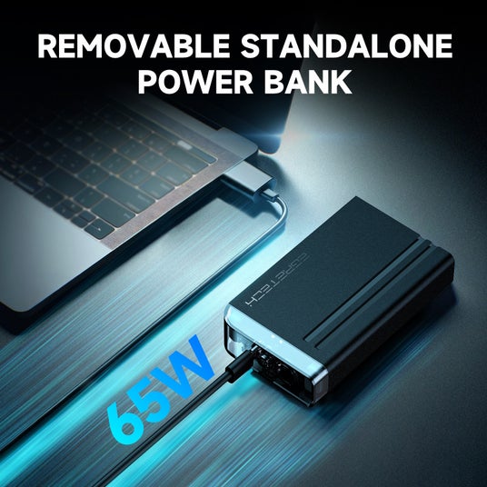 取外したバッテリーはモバイルバッテリーとして使用可能です。バッテリー容量25,000mAhと大容量にもかかわらず、約560gと軽量ですので、持ち運びにも便利です。USB PD65W入出力対応のType-C ×1ポート搭載しており、各デバイスへの急速充電に対応しております。