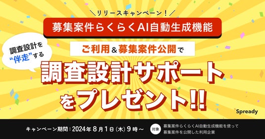 募集案件らくらくAI自動生成機能リリースを記念しまして、先着100社を対象にSpreadyのカスタマーサクセスが調査設計を伴走する調査設計サポートをプレゼントいたします。対象となった企業の利用者に向けて担当からご連絡をさせていただきます。