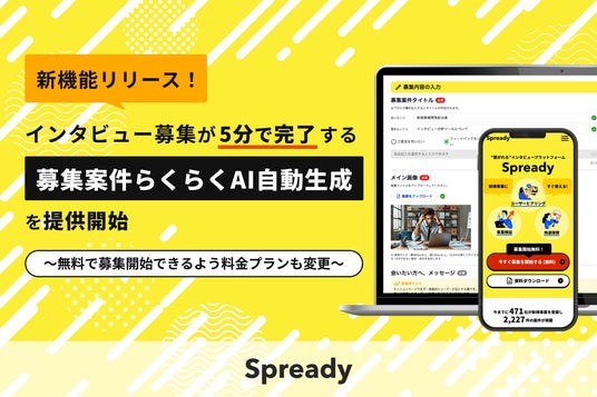 インタビュープラットフォーム「Spready」、インタビュー募集が5分で完了する「募集案件らくらくAI自動生成」を提供開始