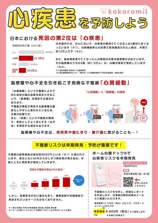 株式会社ココロミル(本社:東京都新宿区、代表取締役社長:林大貴、以下「ココロミル」)は、8月10日の「健康ハートの日」に合わせて、心疾患予防の啓発キャンペーンを実施いたします。本キャンペーンでは、不整脈や心疾患に対する理解を促進し、早期発見と予防の重要性を広めることを目的としています。