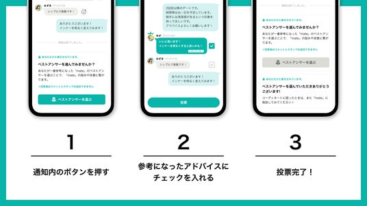 - 相談者はベストアンサーを選ぶことで、mateに対して自分がどんなアドバイス・コメントを求めているかを明示できます。これにより、次の相談時には前回のベストアンサーを踏まえ、より自身が求める内容に近いコメントを集めることが可能となります。