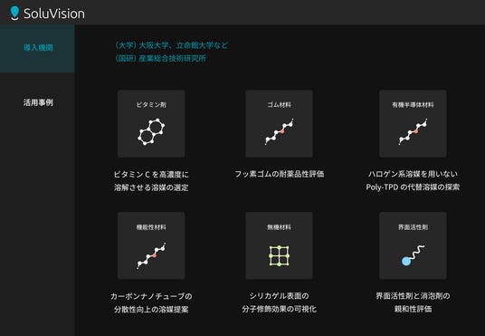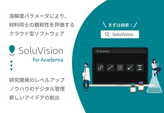 株式会社Material Doorsは、「ハンセン溶解度パラメータ」に基づく実験化学者向けクラウド型ソフトウェア「SoluVision」について、新たにアカデミア向けプランを提供することとなりました。アカデミア向けプランは、大学や国研において研究開発に従事する実験化学者の皆様に、より手軽に「SoluVision」を利用していただくことを目的としています。