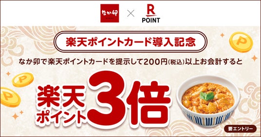 本キャンペーンは、「楽天ポイントカード」が2024年4月22日(月)より、「なか卯」において利用可能になったことを記念して開催します。キャンペーン期間中にエントリーのうえ、「なか卯」の対象店舗で「楽天ポイントカード」もしくは「楽天ポイントカード」機能が搭載されたアプリ、または「楽天カード」裏面のバーコード(注)を提示して200円(税込)以上の会計をした方に、「楽天ポイント」を通常の3倍進呈します。