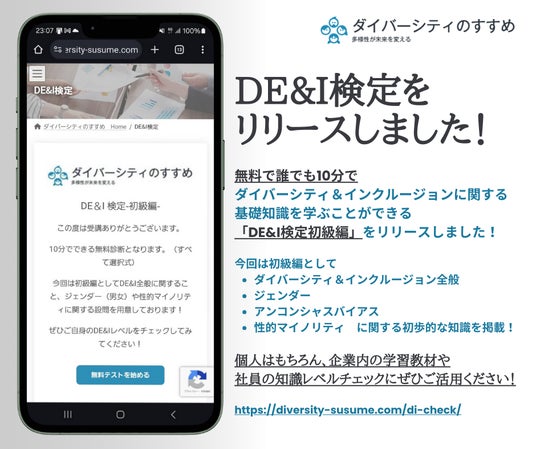 ダイバーシティ&インクルージョンの推進に特化したコンサルティング企業である「ダイバーシティのすすめ」(運営企業:株式会社Colorida Style/本社:東京都新宿区、代表:室田 美鈴)は2024年8月1日(木)より、無料でダイバーシティ&インクルージョンに関する基礎知識がチェックできる「DE&I検定」をリリースしました。