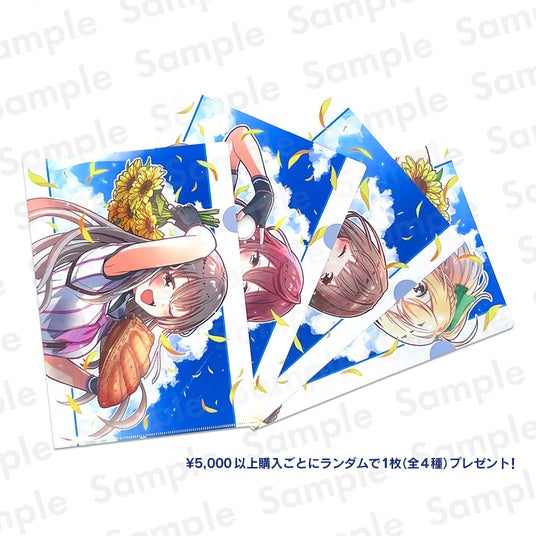 また、期間中5,000円以上ご購入ごとに、特典として描き下ろしイラストのクリアファイル(全4種)をランダムで1枚プレゼントいたします。