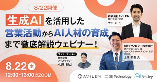 AIポータルメディア『AIsmiley』を運営するアイスマイリー(東京都渋谷区、代表取締役:板羽晃司)は、2024年8月22日(木)12時から生成AI/AI人材の育成をテーマにウェビナーを開催します。