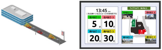 右:施設館内に設置されるサイネージ表示画面イメージ。出庫所要時間と出口ライブカメラ映像を表示。