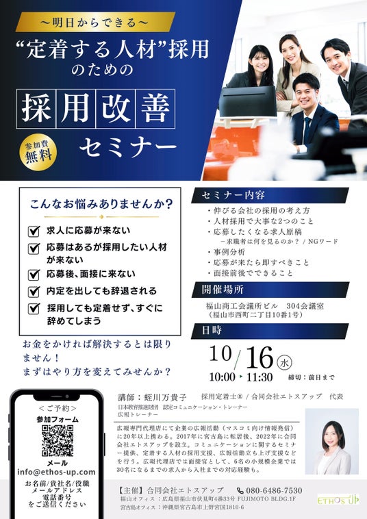 組織の成長をコミュニケーションの観点から支援する合同会社エトスアップ(所在地:沖縄県宮古島市、代表:蛭川万貴子)は、2024年10月16日(水)に、「“定着する人材”採用のための採用改善セミナー」を無料開催いたします。本講座の講師は、採用定着士(R)の資格を持つ当社代表の蛭川万貴子が務めます。