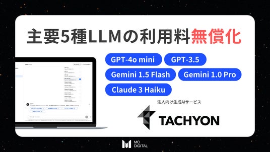 テクノロジーをもって企業の課題解決を支援するエムシーデジタル株式会社(本社:東京都千代田区、代表取締役社長:河内 伸学)は、GPT/Gemini/Claudeの複数LLM利用が可能な法人向け生成AIサービス「Tachyon 生成AI」において、「GPT-4o mini」をはじめとした主要LLM5種の利用料無償化を発表いたしました。