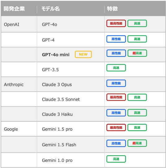 - GPT-4o mini:OpenAI社の最新モデル「GPT-4o」を軽量化したモデルで、高速かつ高性能な処理が可能です。
