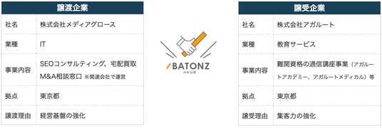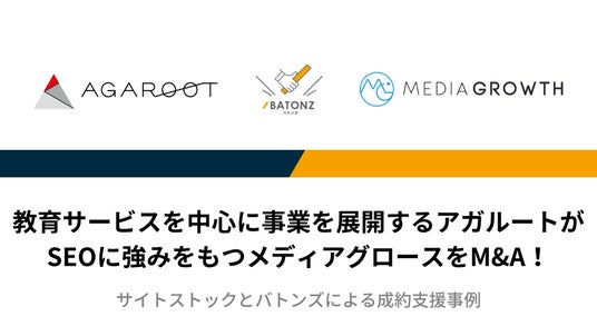 M&A・事業承継支援プラットフォーム「BATONZ(バトンズ)」を運営する株式会社バトンズ(本社:東京都中央区、代表取締役CEO:神瀬悠一、以下バトンズ)は、株式会社サイトストック(本社:東京都渋谷区、代表取締役:渡邉真人)とともに、株式会社アガルート(本社:東京都新宿区、代表取締役:岩崎北斗、以下アガルート)と、株式会社メディアグロース(本社:東京都新宿区、代表取締役:舟崎友貴、以下メディアグロース)のM&A成約を支援したことをお知らせします。