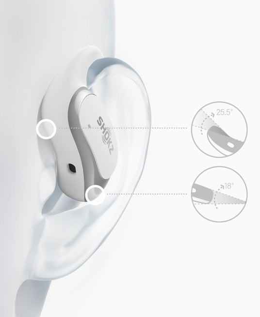 人間工学に基づいたデュアル・ベベル・デザインOpenFit Airの、人間工学に基づいたデュアル・ベベル・デザインは、Shokz Labの優れた開発者たちによって生み出されました。多岐にわたる広範囲な研究と度重なるテストを通じて、単なるフィット感ではなく、揺るぎない、安全かつ安定したフィット感、そして正面から見た時にスマートになるよう設計しました。