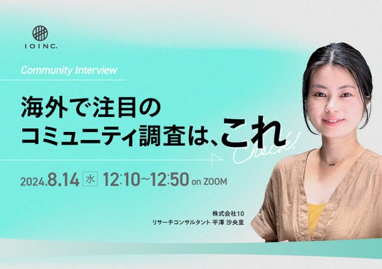 共体験から価値を共創する株式会社10(本社:中野区、代表取締役 佐藤 尊紀、以下10INC.)は、8月14日(水)12:10から、無料ウェビナー「コミュニティインタビュー 海外で注目のコミュニティ調査はこれ」を開催します。