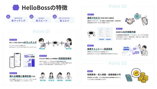 『HelloBoss』は従来の「仲介型」や「掲載型」などの求人サービスと徹底的な差別化を図る、日本初の第3世代AI採用サービスです。NGA独自のAIによる企業と求職者のマッチング・チャット機能(特許第7299663号)を設けており、格安の料金体系と合わせて提供することで採用の効率アップ&コストダウンを実現し、社会全体の人材流動を促すことを目指しています。また、ChatGPT相当の言語モデル「GPT-4」が実装され、日本で初めて、求人サービスでの企業側の募集要項や求職者側の自己PRの自動作成が可能になり、ChatGPT技術による採用や求職に関するカウンセリングを受けることもできます。加えて国内最大級の540万社の企業データベースが利用でき、現在初期ユーザー限定で無料公開中です。さらに、生成AIで履歴書写真が作れる機能も無料で提供しています。2023年11月時点では導入企業が1,000社を超えています。