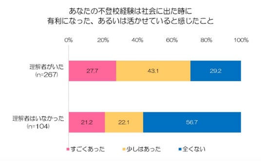 一方で、同調査によると、不登校期間に『理解者がいた』と回答した不登校経験者(n=371)は『理解者がいなかった』人の約 2 倍、不登校の経験が有利に働いたと答えており、不登校の子ども達にとって『理解者がいる』ことが子どもの将来に大きな意味を持っています。