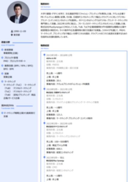 Value fileは、新規案件の獲得を積極的に目指すフリーランスのコンサルタント、キャリアの次のステップを考えている経験豊富なコンサルタント、効率的な職務経歴書の管理と自己PRを強化したいすべてのコンサルタントに最適です。