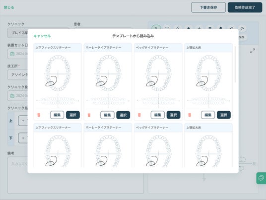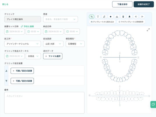 技工指示書ページでは、セット日、患者名、患者番号、担当医師、模型種類、装置種類、模型発送ステータスを管理できます。従来の紙の技工指示書のように、テキストだけでなく絵で指示内容を表現することも可能です。また、技工指示内容はテンプレートとして保存でき、頻繁に使用する発注装置の指示内容をすぐに読み込めるため、発注作業の時間を短縮することが期待されます。