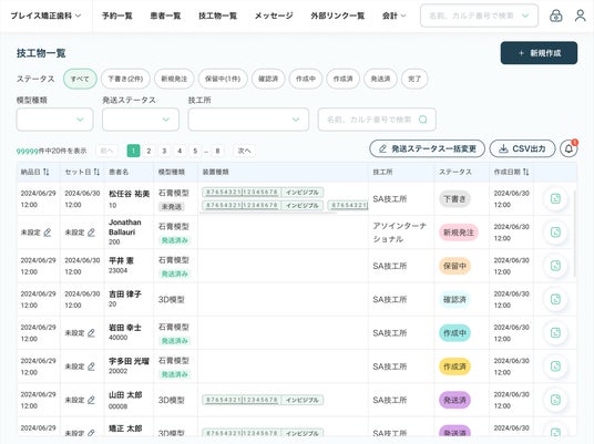 技工物一覧ページでは、納品日、セット日、患者名、患者番号、模型種類、装置種類、指示書ステータス、技工所管理ステータス、模型発送ステータスを一元的に確認・参照することができます。