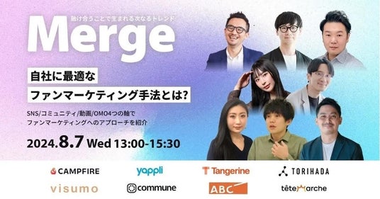 コミューン株式会社は、2024年8月7日(水)にオンラインカンファレンス『Merge』を開催することをお知らせいたします。本カンファレンスは、「SNS」「コミュニティ」「動画」「OMO」という4つのセッションテーマをもとに、参加企業のみなさまが自社にとって最適なファンマーケティング手法を見つけることを目的としています。