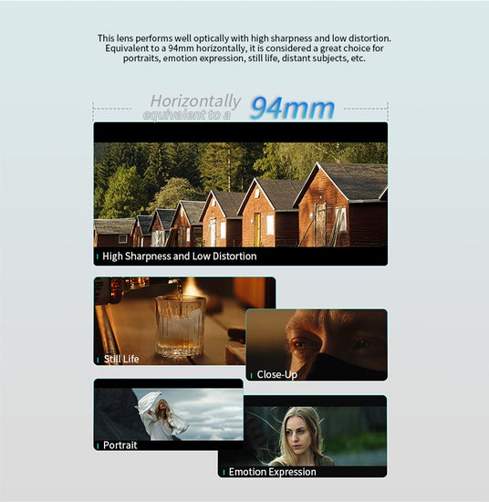 このレンズは光学的に優れ、高いシャープネスと低い歪みを持っています。水平方向で94mmに相当し、ポートレート、感情表現、静物、遠距離の被写体などに最適とされています。